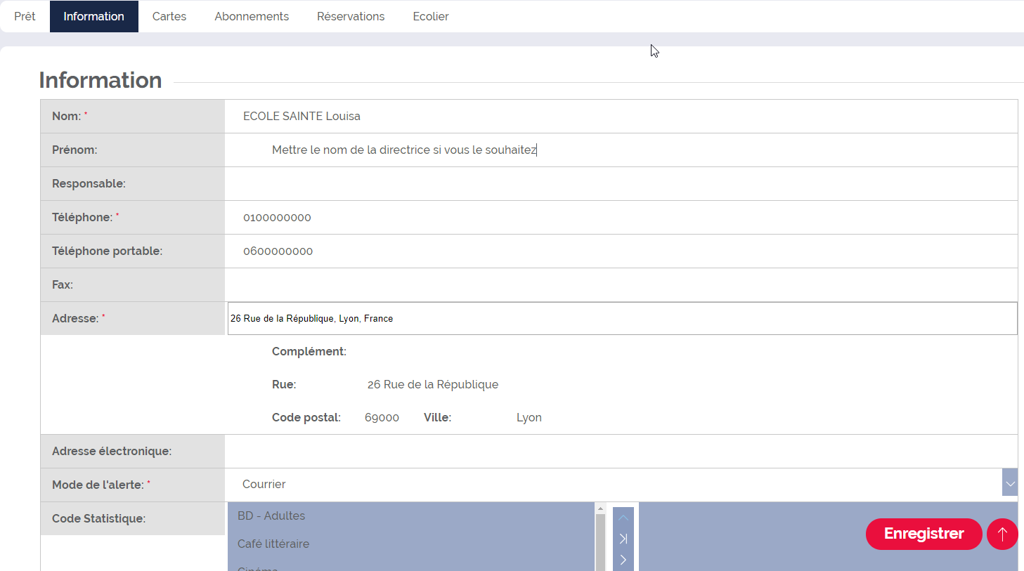 Ici en exemple nous avons le nom d'un usager, ors c'est école qui doit être enregistré.