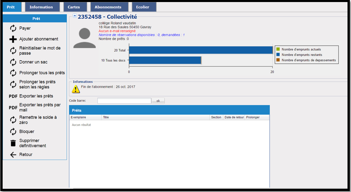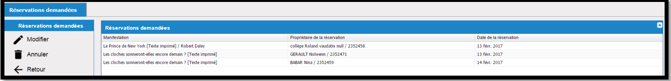 Propriétaire de la réservation : Comme indiquée c'est le nom de l'usager ou de l'organisme qui a emprunté le document
